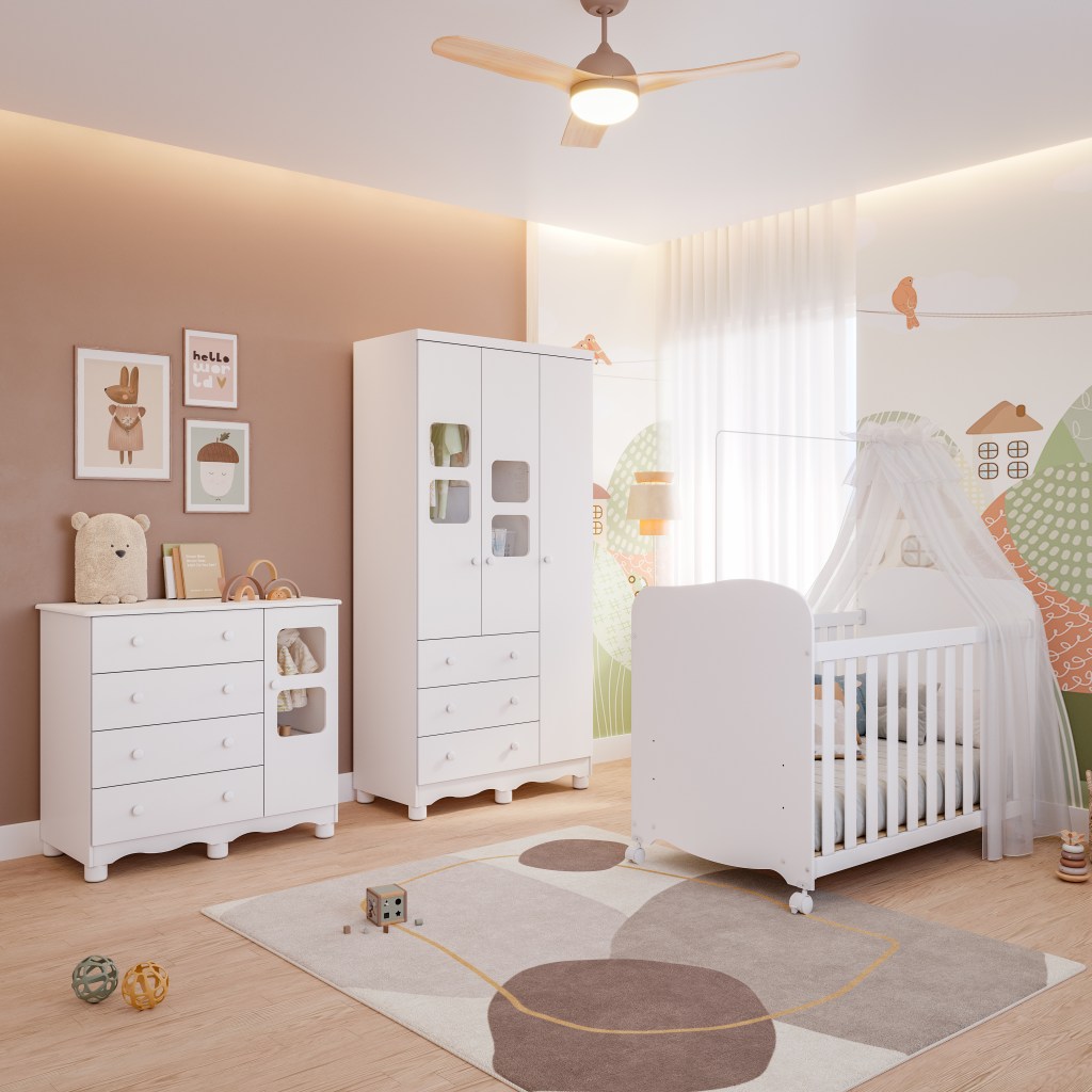 Ao planejar o quarto do bebê, opte por móveis que aliam funcionalidade e qualidade. Um quarto completo é uma excelente opção, pois inclui peças como berço, cômoda e guarda-roupa, garantindo organização e praticidade.